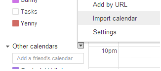 - For each TA, import the CSV document created in step 1 by clicking “import calendar” under the “other calendars” tab in Google Calendar. For the options, select the CSV document for a specific TA, and for the “calendar” option, select the calendar you created in step 2 for that specific TA. (Life will be easiest if you only perform this step once, because if you try to import a calendar twice, you’ll get error messages that you’ve already imported these events before.)