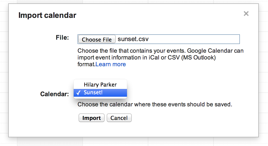 Select the .CSV you created using the create_sunset_cal() function, making sure you select your newly-created “Sunset” calendar.
